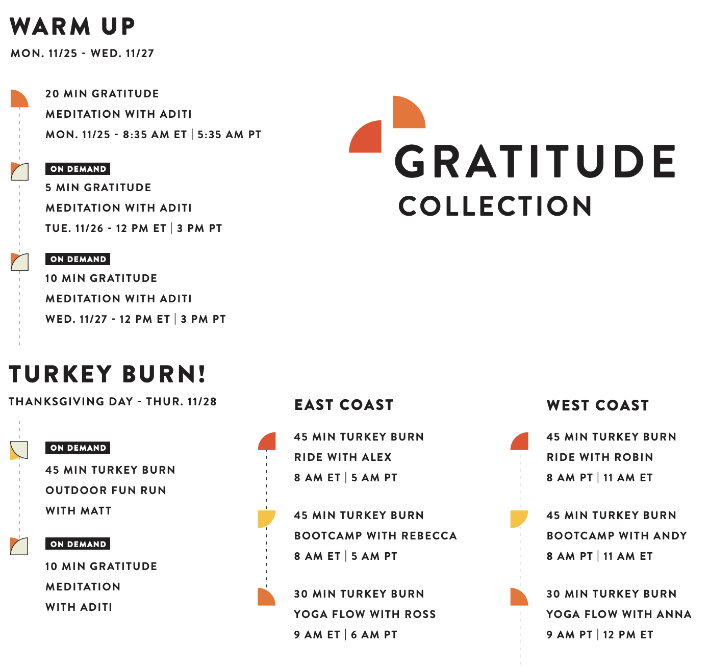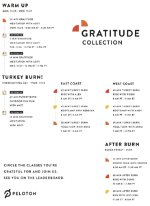 If you can’t make any of those workouts live, you can always catch them on-demand later in the day, or there will be 2 other Turkey Burn workouts launching directly to on-demand. Matt Wilpers will have a 45 minute Turkey Burn Outdoor Fun Run that will launch sometime on Thanksgiving Day, and Aditi will have another 10 minute Gratitude meditation that launches Thursday directly to on-demand as well.