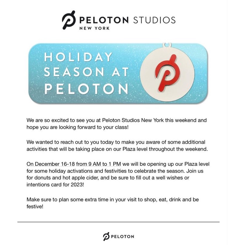 Peloton will host holiday celebrations at Peloton Studios New York (PSNY) this weekend for members who are signed up for in-person classes. Peloton sent an email to participating members: