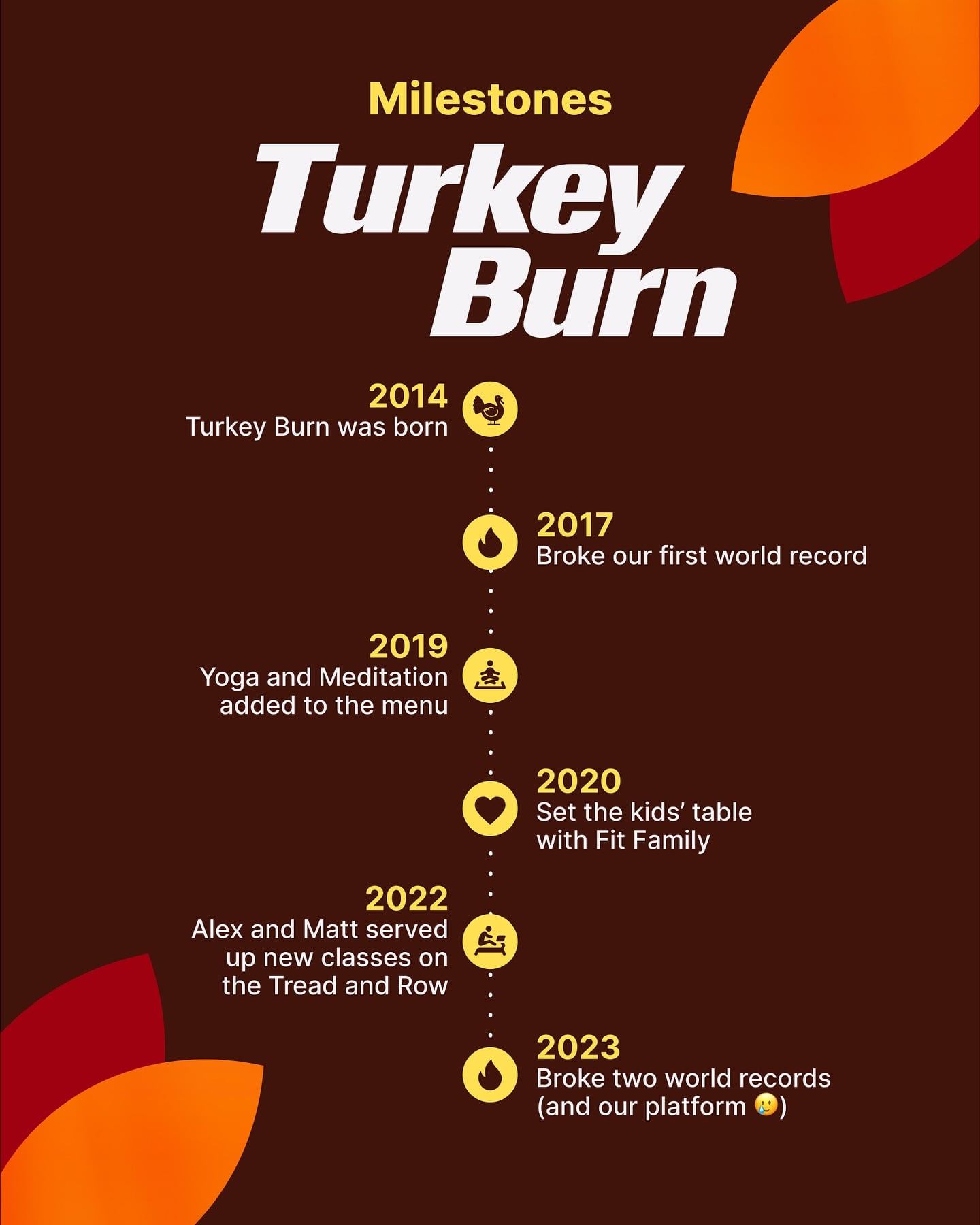 Peloton’s post includes an overview of Turkey Burn “milestones” – including the year Turkey Burn launched in 2014; the first record-breaking year in 2017; adding new fitness modalities to the celebration in 2019, 2022, and 2022; and finally, breaking two world records and crashing the entire Peloton platform in 2023.