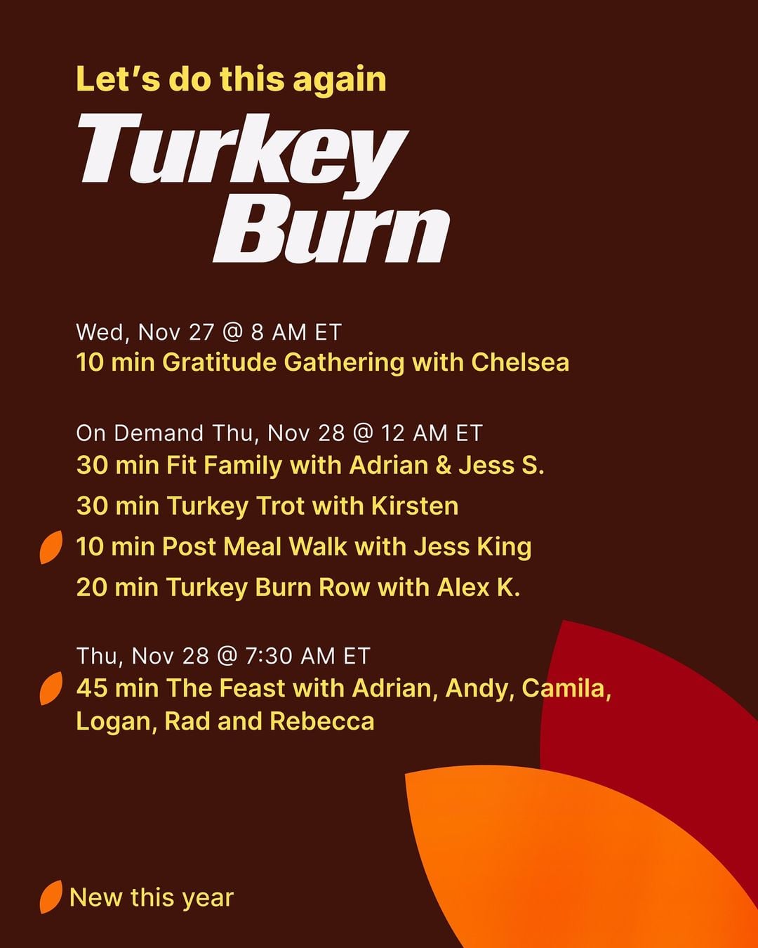 Classes will be a mix of live and straight to on-demand drops. You can view the complete class list of Peloton’s Thanksgiving & Turkey Burn classes below: