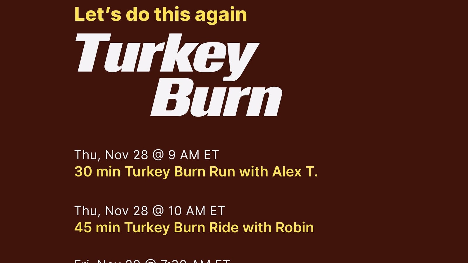 - 45 min. Turkey Burn Ride – Robin Arzón – 11/28/24 @ 10:00am ET