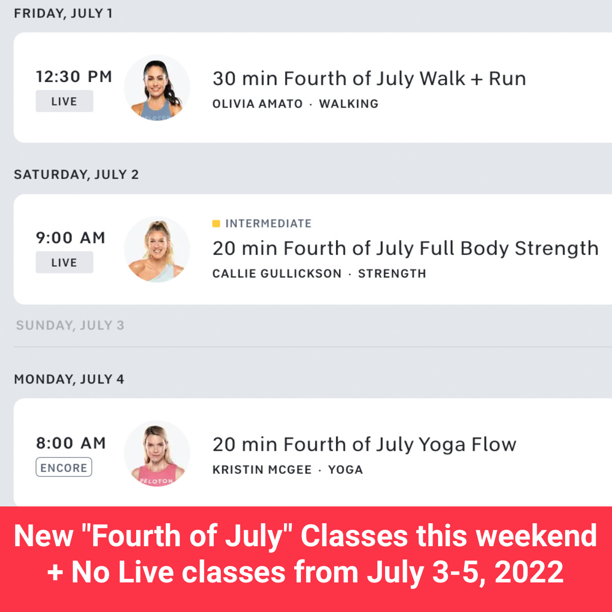 Peloton also has a number of “Fourth of July” classes on the schedule, two of which will happen live. There will be a walk + run, strength, and yoga class. You can view the complete list of classes below: