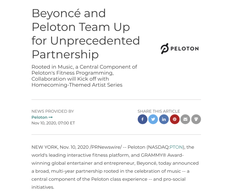 Peloton & Beyoncé announced a multi year collaboration today, that will see a homecoming themed artist series with Beyoncé, as well as a partnership with 10 different HBCUs, who will get free Peloton Digital memberships.