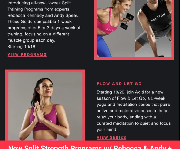 Peloton will release 2 new split strength training programs (with Rebecca Kennedy & Andy Speer) and launch a new season of Flow & Let Go with Aditi Shah in October 2023.