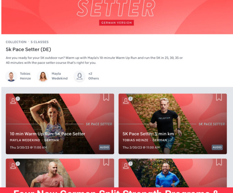 Peloton has released four new split strength programs and one new outdoor 5K pace setter running collection in German.