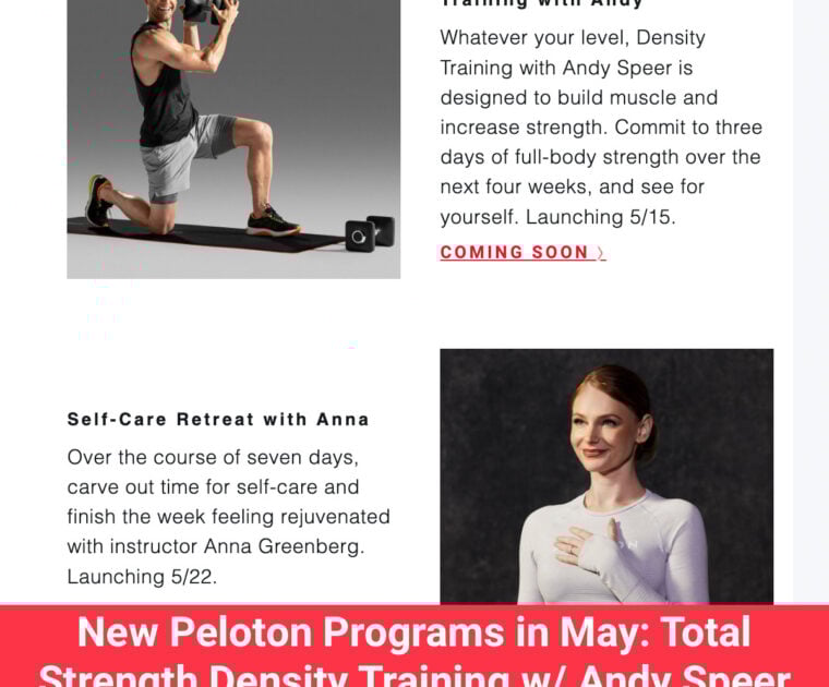 New Peloton Programs in May: Total Strength Density Training w/ Andy Speer and Self Care Retreat w/ Anna Greenberg