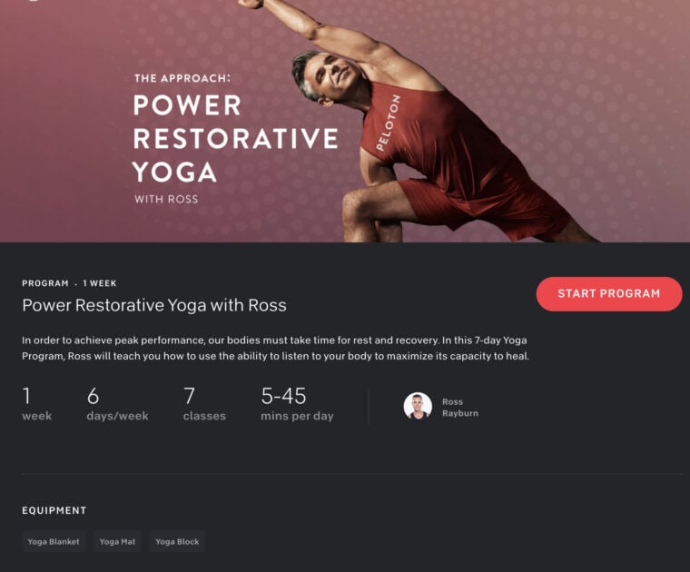 Peloton has launched a new “Power Restorative Yoga” program with Ross Rayburn – a 1 week class designed to “teach you how to use the ability to listen to your body to maximize its capacity to heal.”