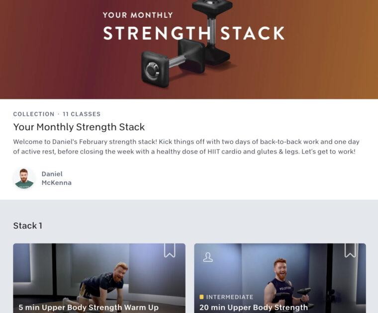 Peloton has released a new “Your Monthly Strength Stack” collection curated by instructor Daniel McKenna for February 2022.