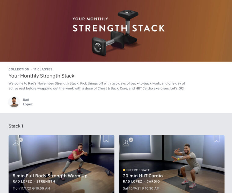 The “Your Monthly Strength Stack” collection is updated for November, and now features a series of Peloton strength and cardio classes by Rad Lopez.