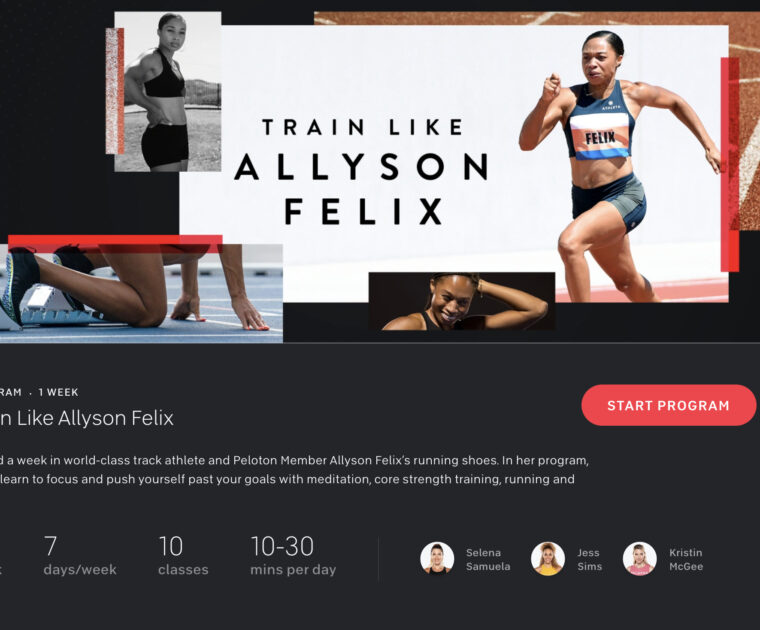 Peloton has created a new 1 week Training Program called “Train Like Allyson Felix”. There are classes from Jess Sims, Selena Samuela, and Kristin McGee.