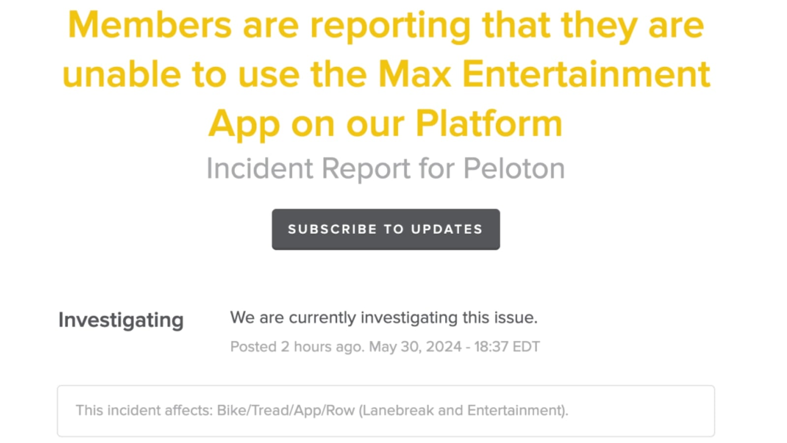 Peloton has acknowledged that there is an issue with HBO Max on Peloton Entertainment and has created an official incident report.