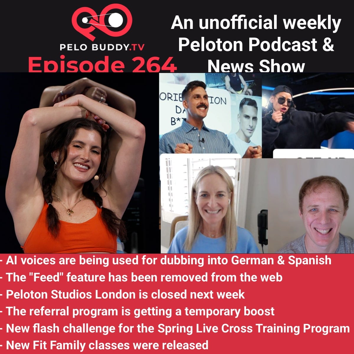 Episode 264 of Pelo Buddy TV, a Peloton podcast & Peloton news show. Top stories are AI voices being used in Peloton classes, the feed being removed, a temporary increase to the referral program & more.