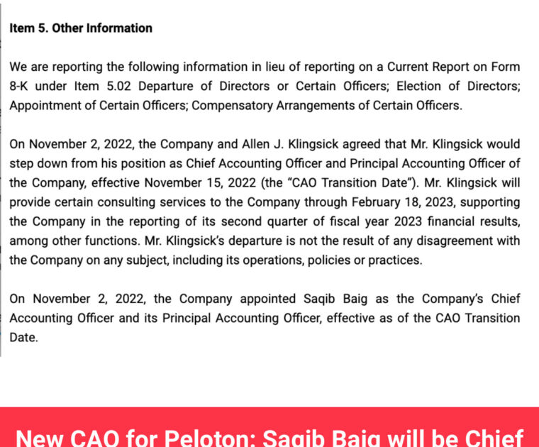 Peloton’s Chief Accounting Officer Allen J. Klingsick will depart on November 15, and will be replaced by Saqib Baig as Peloton’s new CAO.