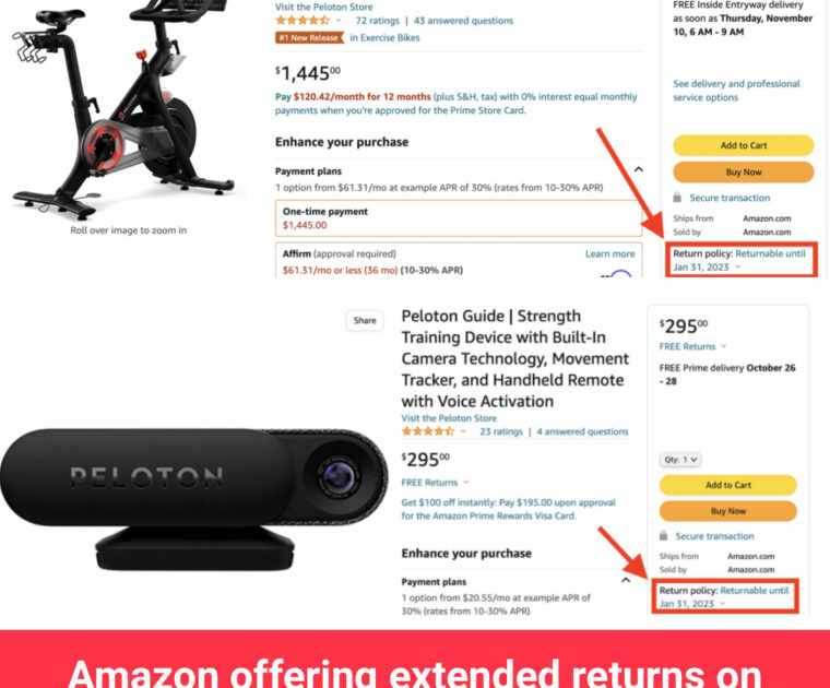 Customers who purchase a Peloton Bike or Guide from Amazon between 10/11-12/25 will be able to return the products through 1/31/23.