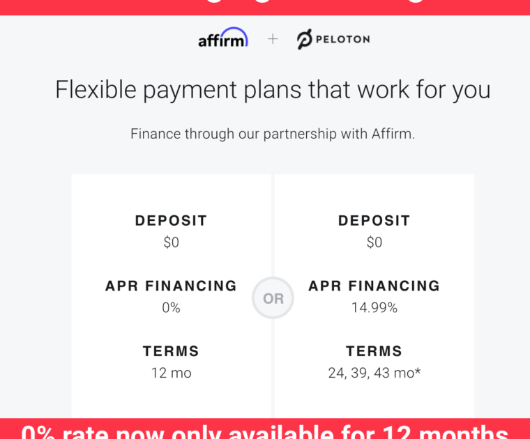 Peloton has updated their financing program so that only the 12 month financing option carries a 0% annual percentage rate (APR). This applies to both Affirm & Klarna.