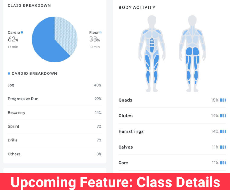 Peloton appears to be beta testing a new feature for the iOS App that allows users to view a body activity section showing the muscles worked, as well as a class breakdown for time spent between cardio and strength for bootcamp content.