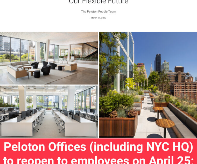 Peloton has announced that they will reopen their corporate offices & headquarters on Monday, April 25, and will be allowing more employees to work remote/hybrid.