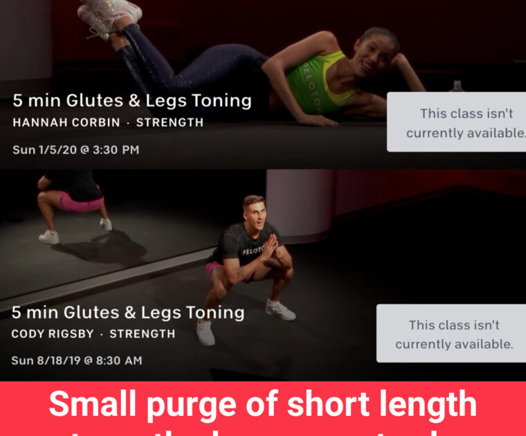 Peloton appears to have completed a targeted purge of on demand classes yesterday, primarily removing 5 minute Glutes & Legs Toning classes from 2019 and 2020.