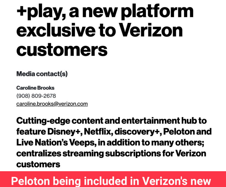 Peloton will be included in Verizon’s new +play platform, which will allow Verizon customers to manage all of their streaming subscriptions and explore new streaming content from one place.