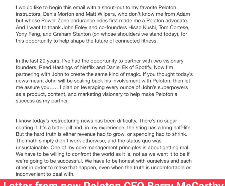 Read Barry McCarthy’s (New Peloton CEO) Email to Peloton Employees