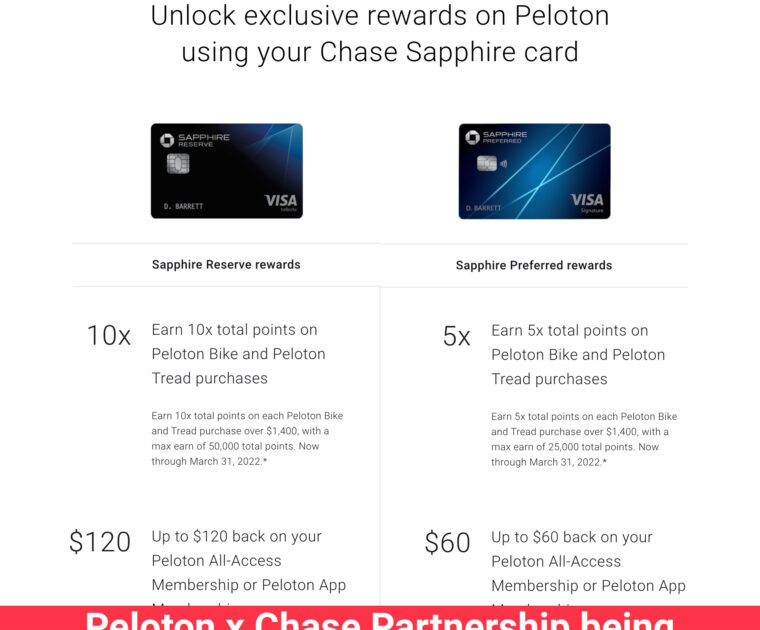 Peloton and Chase have extended their partnership, which offers Chase Sapphire cardholders statement credits and bonus points, through June 30, 2022.