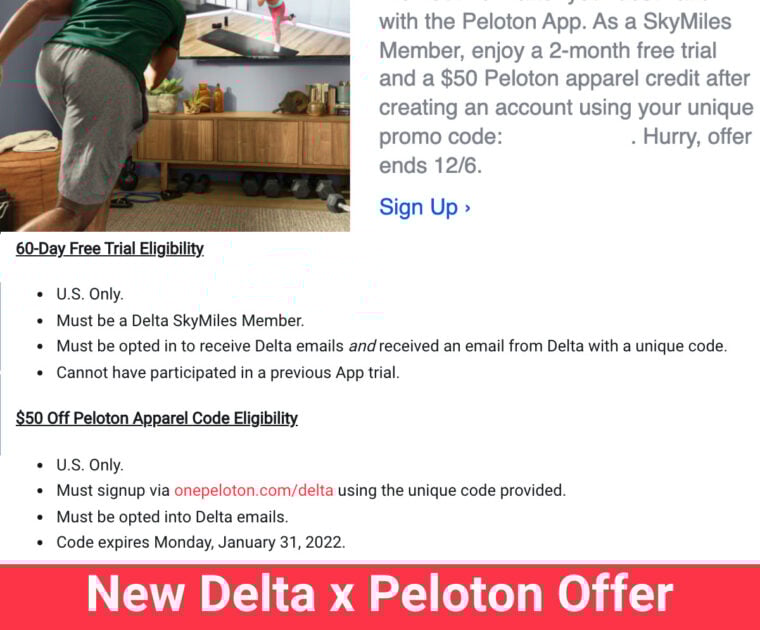 Peloton is offering an extended free trial and $50 Peloton Apparel credit for Delta SkyMiles Members as part of their expanded partnership.
