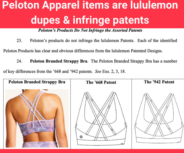 lululemon claims Peloton Apparel collection contains lululemon dupes & infringes on patents; Peloton countersues