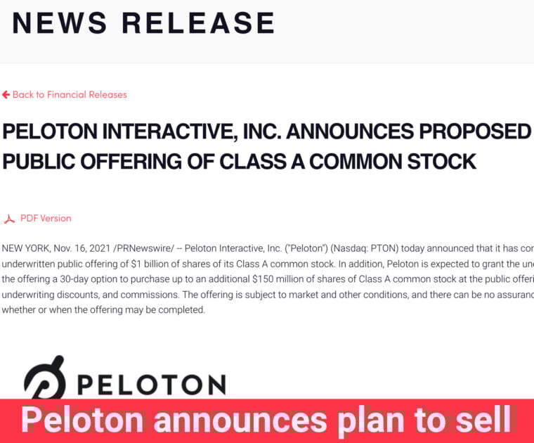 This morning Peloton announced a plan to sell $1 billion of their Class A common stock – a sign that they need to raise money in light of recent tough weeks for the company.