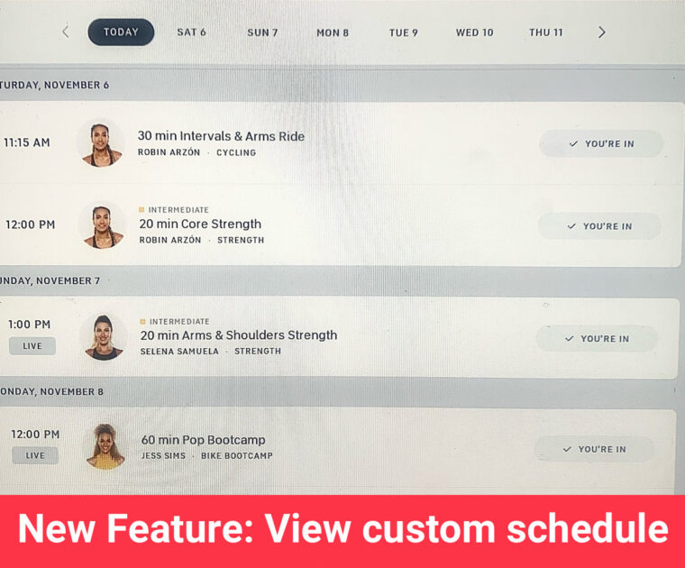 Peloton has made their “Scheduling” feature available on all Bike, Bike+, Tread, and Tread+ equipment – you can now view your schedule on the Bike or Tread and add new classes.
