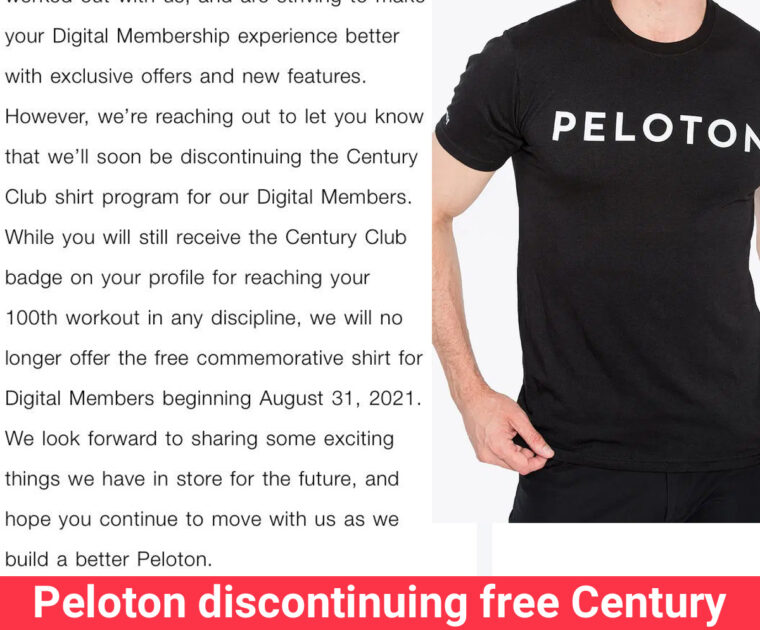 Peloton discontinuing free Century Club T-Shirts for Digital members as of August 31, 2021.