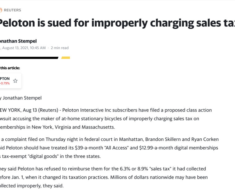A new class action lawsuit filed against Peloton alleges they were improperly charging sales tax on the All Access & Peloton Digital membership costs.