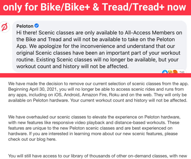 Some Peloton users are reporting seeing a message that indicates Peloton will be removing scenic rides & runs from the Peloton apps (but not hardware) starting tomorrow.