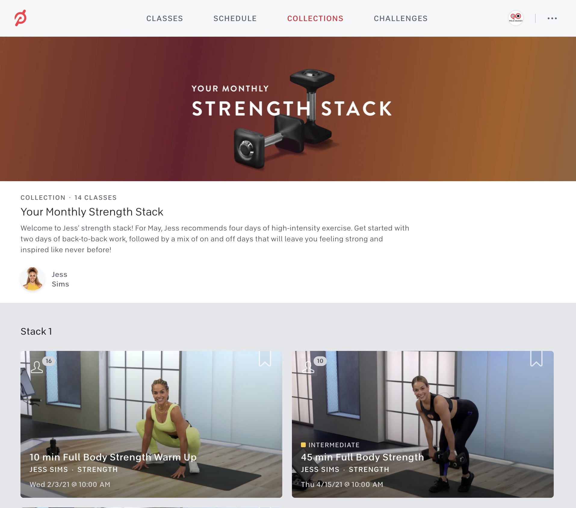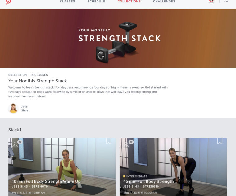 The “Your Monthly Strength Stack” collection is updated for May, and now features a series of Peloton strength & cardio classes by Jess Sims.