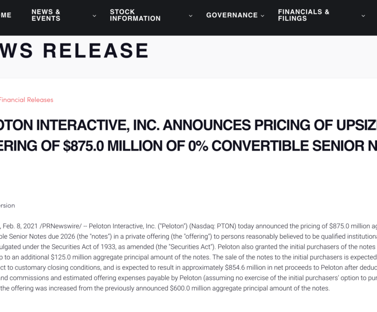 Peloton announced that they would be raising nearly $1 billion through an offering of Convertible Senior Notes.