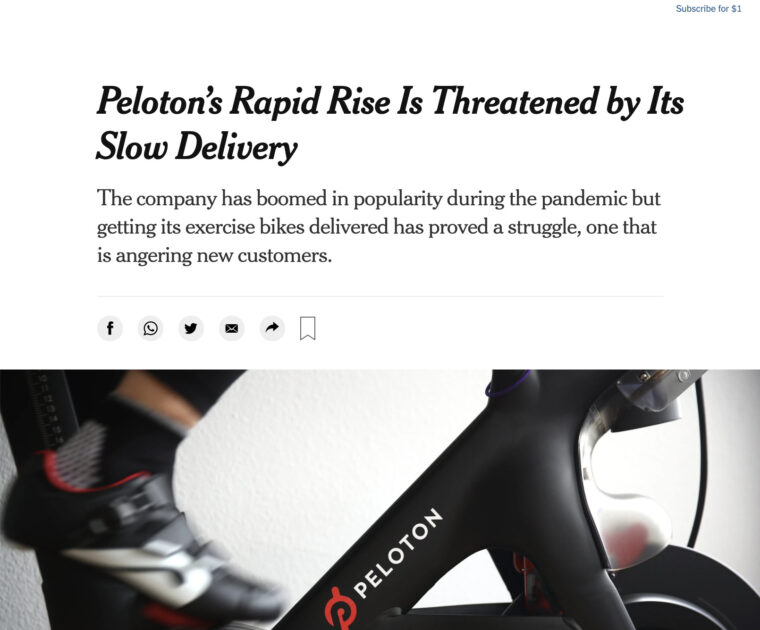 The New York Times has a piece this morning highlighting Peloton’s recent order backlog and delivery delays.