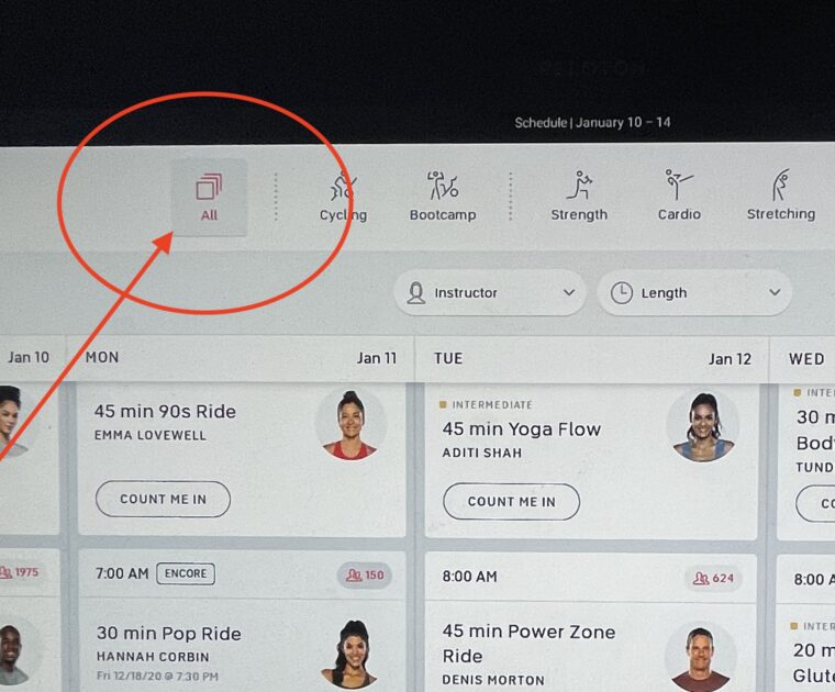 Peloton has updated the Bike and Tread to allow users to view the almost full upcoming class schedule and on-demand library, across all class types, in one place.