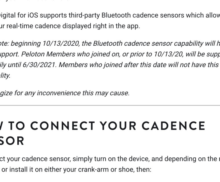 Peloton appears to be phasing out support for Bluetooth cadence sensors on their iOS app. The feature will be completely removed on June 30th, 2021.