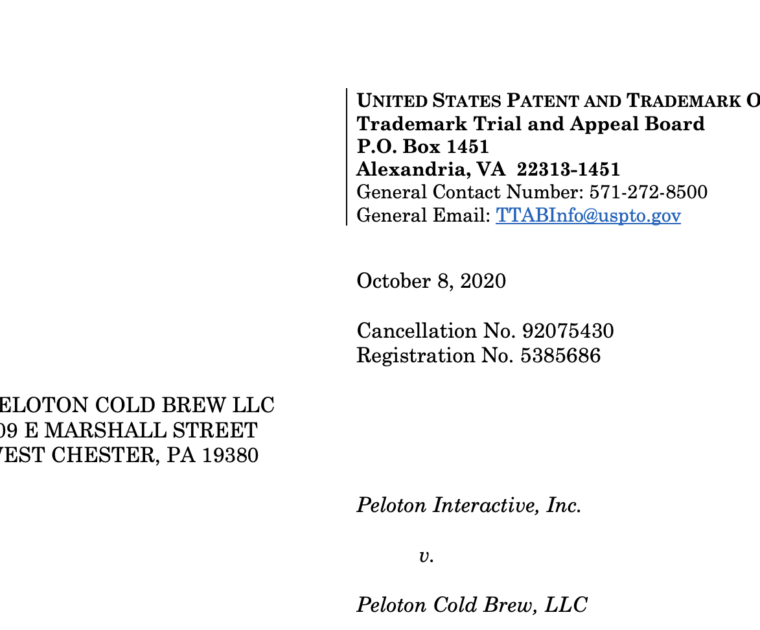 Peloton has filed a notice with the USPTO requesting a trademark be cancelled that was previously granted to Peloton Cold Brew, LLC, a tea and coffee company.