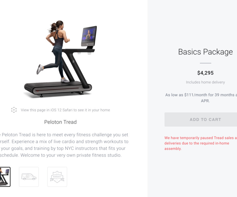 Peloton has suspended delivery & new sales of all Peloton Treads as of March 18th, but is continuing bike deliveries (with modifications) and sales.