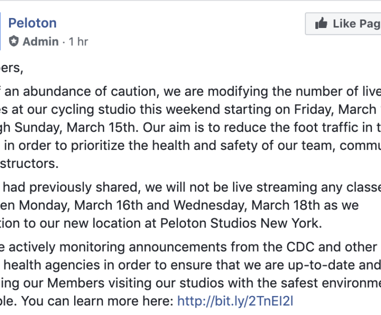 Peloton updates members on Coronavirus prevention plans