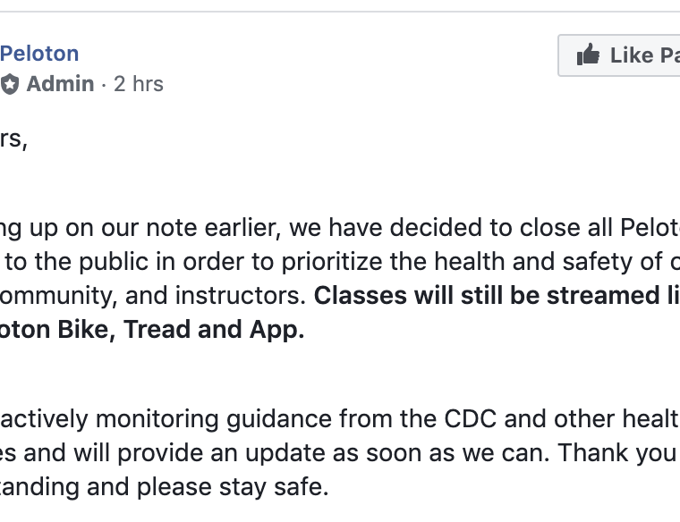 Peloton has closed their studios to the public in an effort to stop the spread of coronavirus COVID-19. Classes will still stream live to members as originally scheduled.
