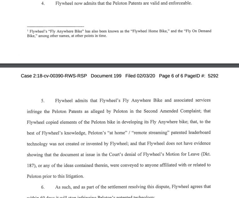 Peloton & Flywheel have resolved their court case, with Flywheel admitting they infringed on Peloton’s patents. Flywheel will remove the technology within 60 days.