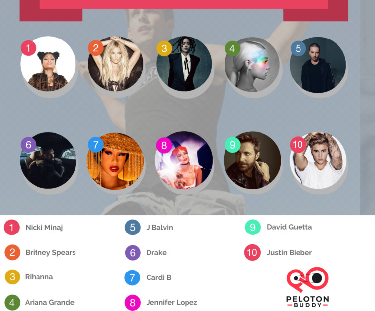 A list of the top 20 artists & most frequent workout types that were featured on Robin Arzon’s playlists during her 2018 Peloton workouts and activities on the tread, floor, and bike.