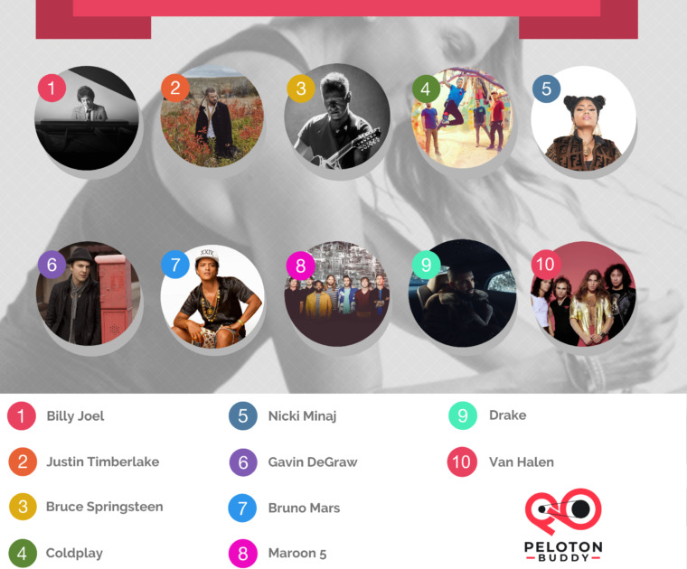 A list of the top 20 artists & most frequent workout types that were featured on Jenn Sherman’s playlists during her 2018 Peloton workouts and activities on the tread, floor, and bike.