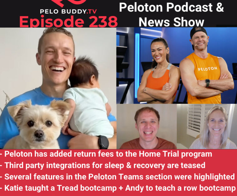 Episode 238 of Pelo Buddy TV, a Peloton podcast & Peloton news show. Top stories are return fees added to the home trial program, Matt Wilpers & Cliff Dwenger are dads, third party integrations for sleep & recovery & more.