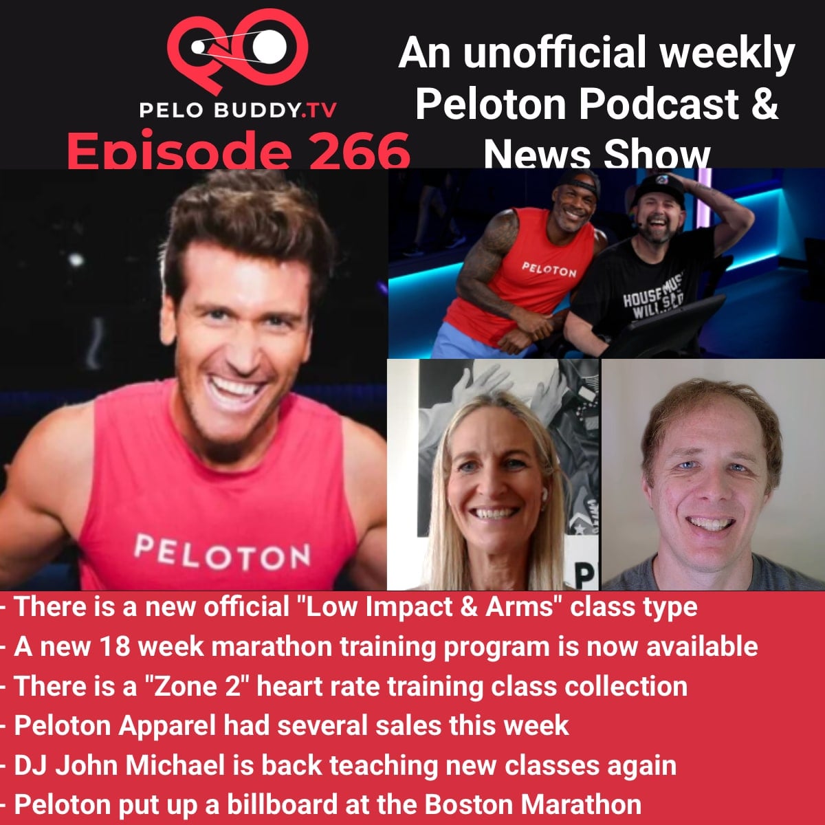 Episode 266 of Pelo Buddy TV, a Peloton podcast & Peloton news show. Top stories are the new Peloton marathon training program, a Zone 2 heart rate training collection, a new low impact & arms class type, and more.