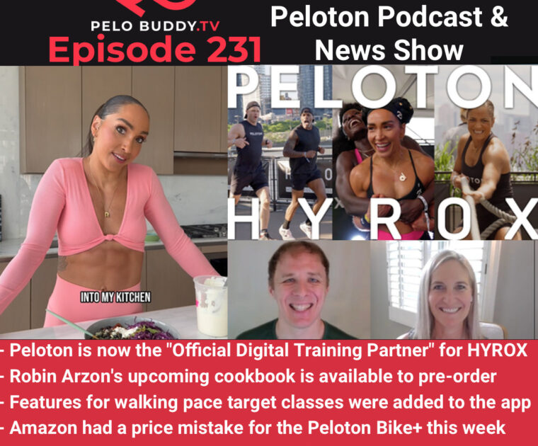 Episode 231 of Pelo Buddy TV, a Peloton podcast & Peloton news show. Top stories are Peloton partnering with HYROX, Robin Arzon’s cookbook info, walking pace target features in the app, a price mistake on the Bike+ and more.