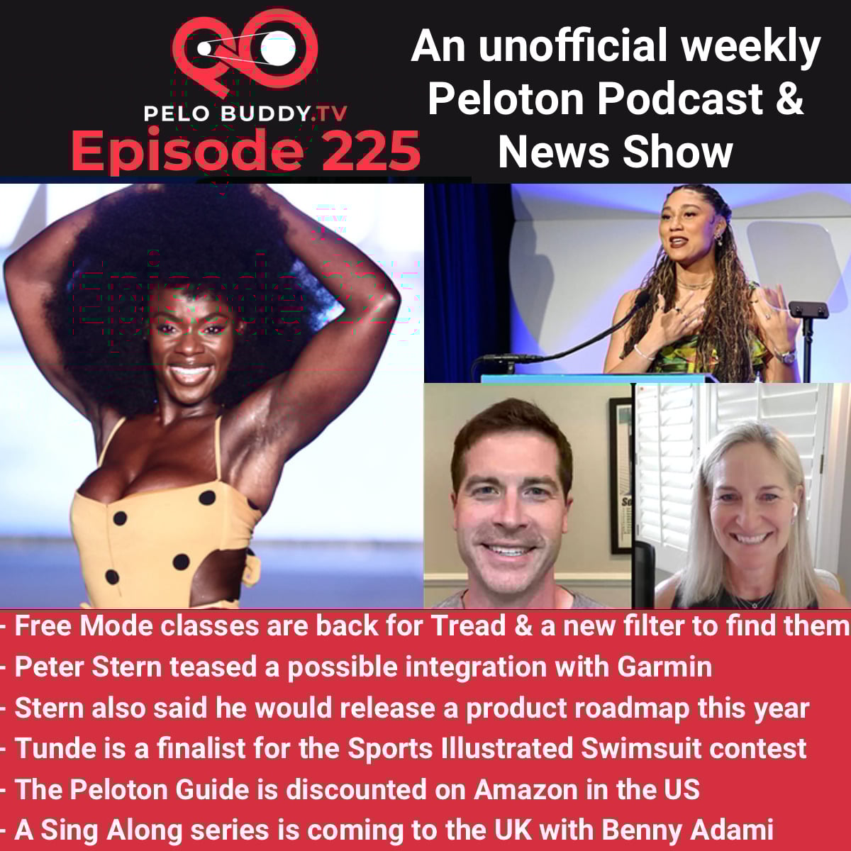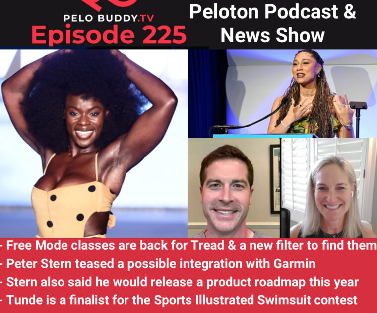 Episode 225 of Pelo Buddy TV, a Peloton podcast & Peloton news show. Top stories are free mode classes back on Tread+, a Garmin integration teased, a product roadmap coming, Tunde Oyeneyin a finalist for Sports Illustrated and more.