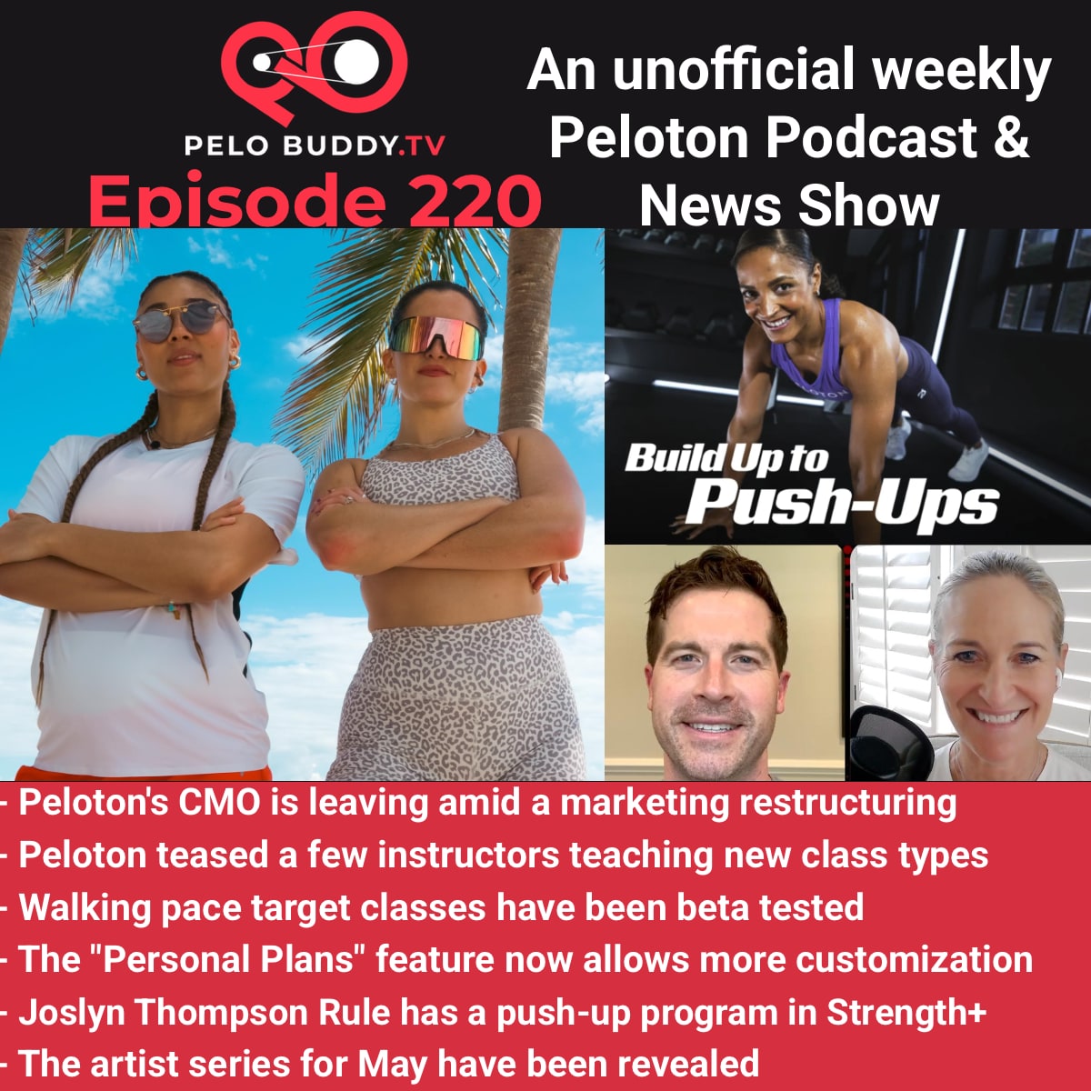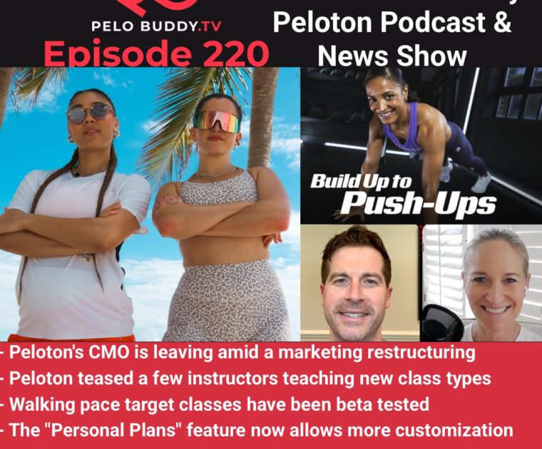 Episode 220 of Pelo Buddy TV, a Peloton podcast & Peloton news show. Top stories are the new class types for instructors teased, CMO leaving, beta walking pace targets, push-ups program with Joslyn & more.
