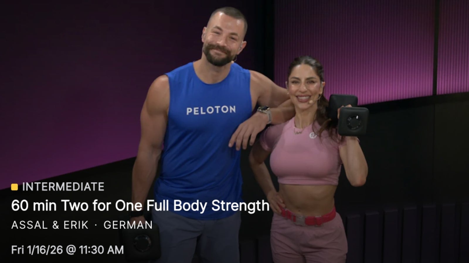 Peloton will have monthly two-for-one 60 minute strength classes instructed in German. The first is available with Erik Jager & Assal Arian.